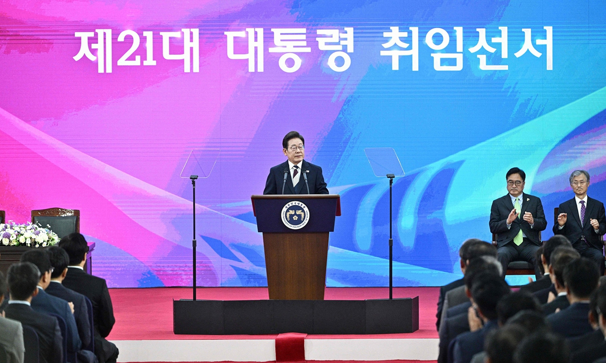 South Korea's President Lee Jae-myung (left) delivers a speech after taking his oath during his inauguration ceremony at the National Assembly in Seoul on June 4, 2025. Photo: VCG