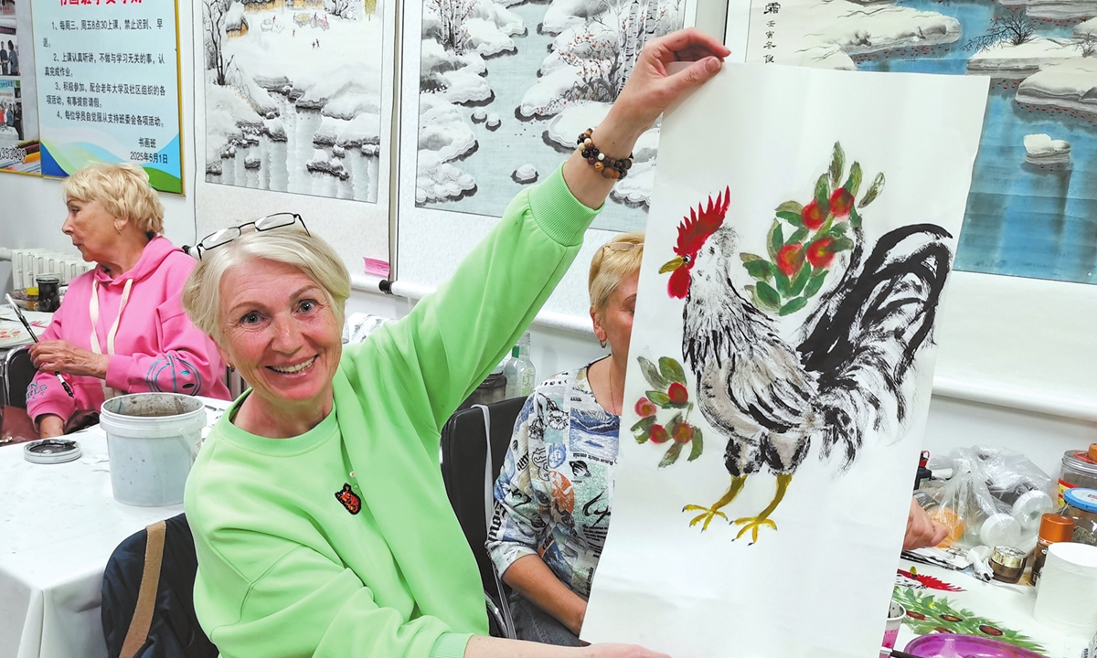 Visiting Russian seniors hold a Chinese traditional painting exchange activity with a local senior university in Suifenhe, jointly painting the Chinese mascot "rooster," on May 23, 2025. Photo: Courtesy of Zhang Chao