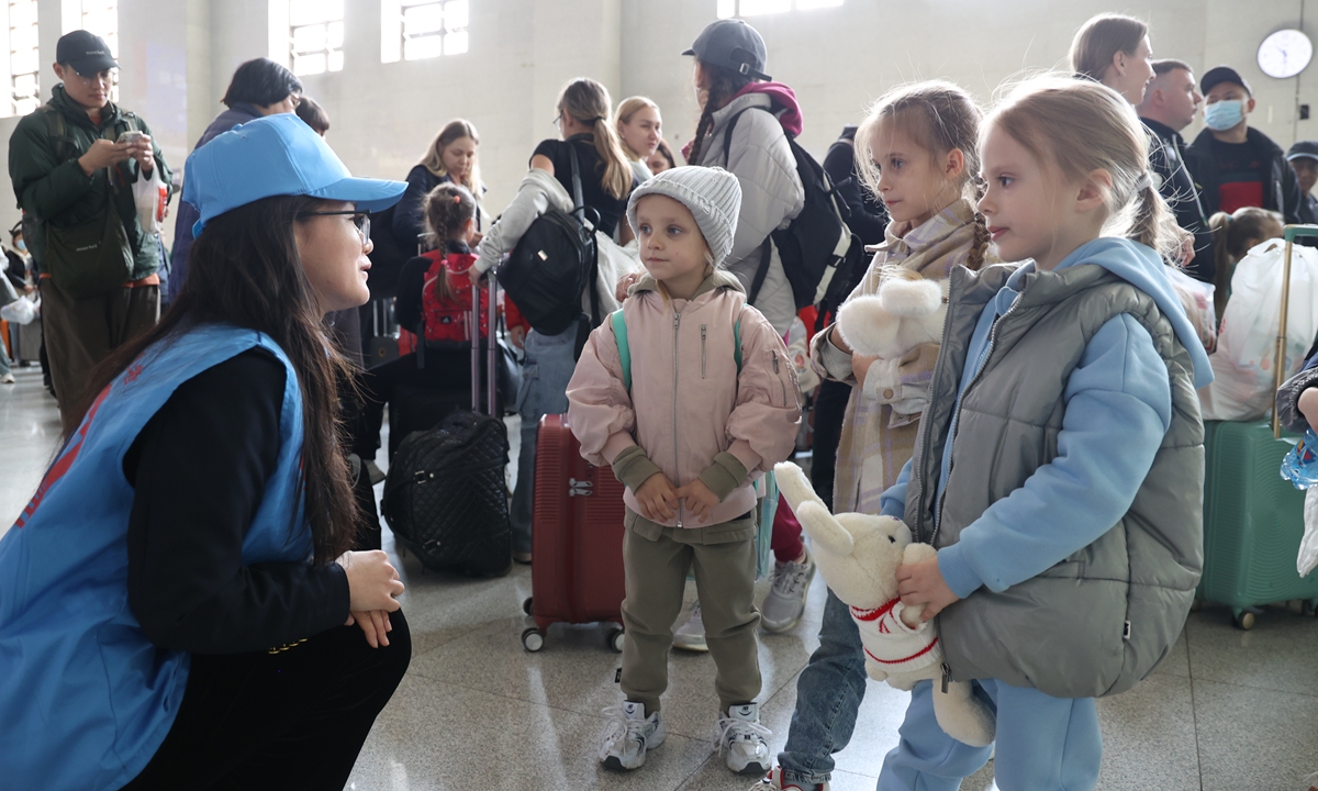 A college student volunteer explains safety precautions for taking high-speed trains to Russian children at the Suifenhe railway station, on April 29, 2025. Photo: Courtesy of Qu Yiwei
