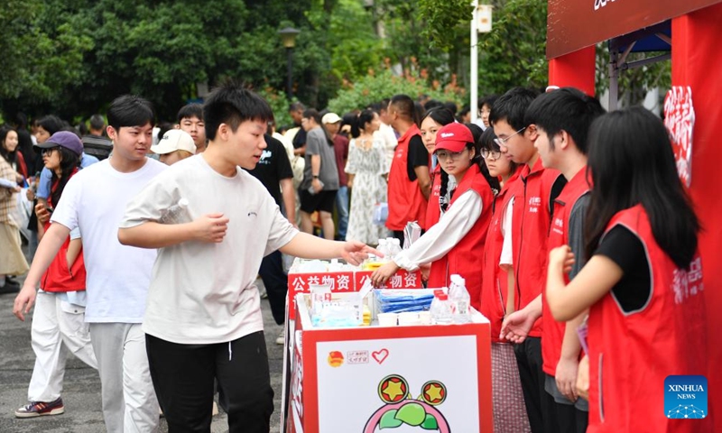 Volunteers provide bottled water to students at a national college entrance examination site in Changsha, central China's Hunan Province, June 8, 2025. Tianxin District of Changsha has organised volunteers to provide help for students and their parents at multiple local examination sites during this year's national college entrance exam. (Photo: Xinhua)