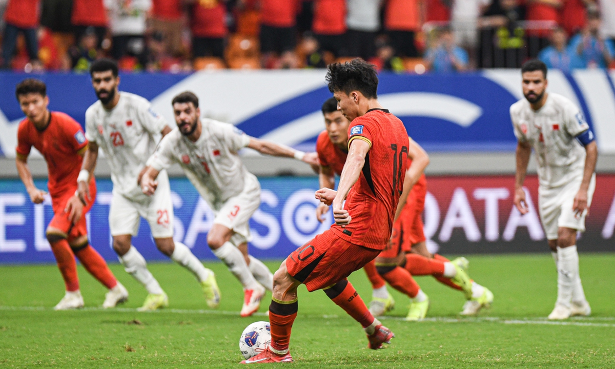 Wang Yudong of China scores from the penalty spot during the 2026 FIFA World Cup Asian Qualifiers Group C match between China and Bahrain in Chongqing on June 10, 2025. Photo: VCG