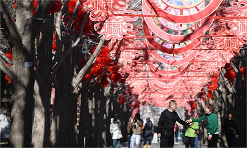 Red lanterns hang in Ditan Park in Beijing on January 19, 2025 as the park gets ready for ...