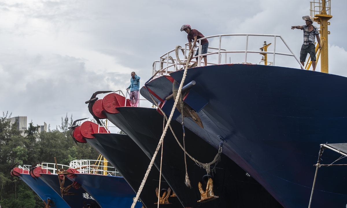 Fishermen reinforce their boats and take precautions against strong winds at a dock in Qionghai, South China's Hainan Province, on June 11, 2025. Typhoon Wutip is expected to make landfall along coastal areas on June 13, which will make it the first typhoon to make landfall in China in 2025. Photo: VCG