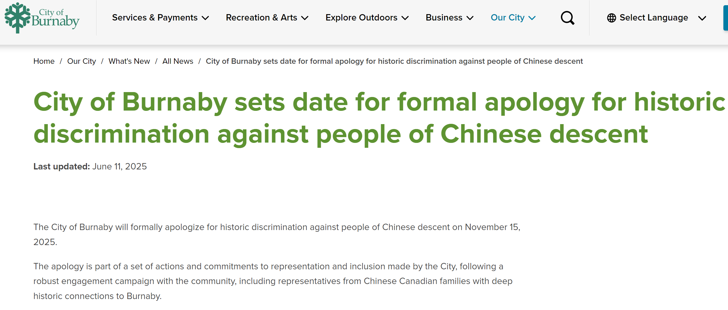 The city said in a news release on Wednesday local time that the apology is part of a set of actions and commitments to representation and inclusion made by the City, following a robust engagement campaign with the community, including representatives from Chinese Canadian families with deep historic connections to Burnaby.