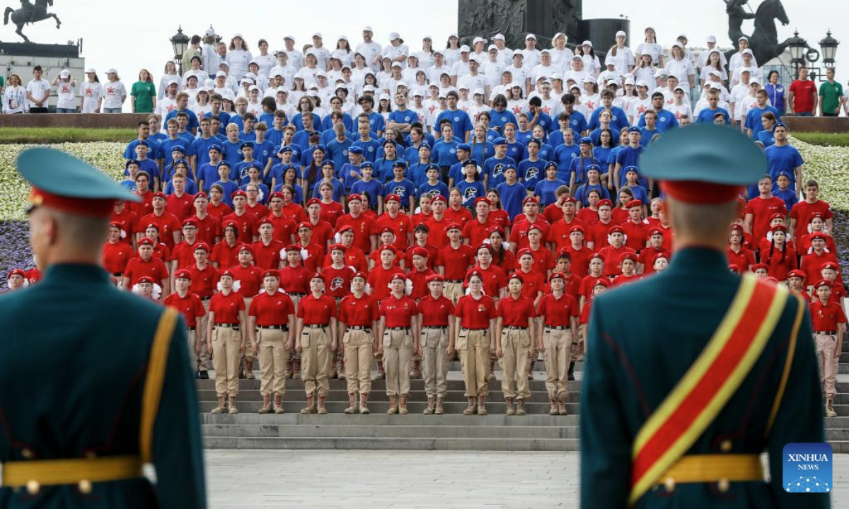 Russian youth, dressed in colors of Russian national flag, attend a national flag-raising ceremony to celebrate the Russia Day at the Victory Park in Moscow, Russia, June 12, 2025. Russia Day marks the date when the First Congress of People's Deputies of the Russian Federation adopted the Declaration of Russia's National Sovereignty in 1990. (Photo by Alexander Zemlianichenko Jr/Xinhua)