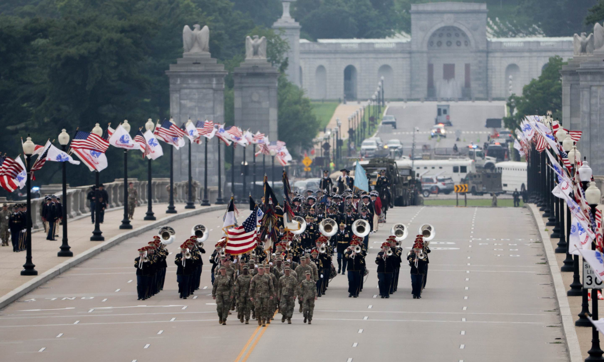 Members of the military march over the Memorial Bridge during the US Army's 250th Anniversary Parade in Washington, DC, US, on Saturday, June 14, 2025. Photographer: Allison Dinner/EPA/Bloomberg via Getty Images
