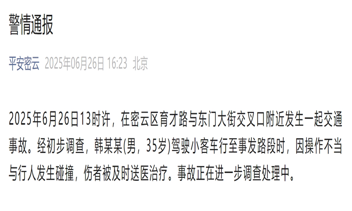A traffic accident occurred near an intersection in the Miyun District of Beijing around 1:00 PM on Thursday. According to initial investigations, a 35-year-old man surnamed Han was driving a small passenger vehicle when the car collided with a pedestrian due to improper operation.