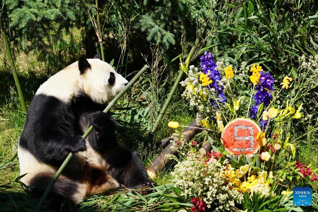 Giant panda Yuan Man enjoys its birthday treat at a panda house in Xining, northwest China's Qinghai Province, June 28, 2025. Two giant pandas Qi Guo and Yuan Man enjoy the celebration of their 9th birthday here on Saturday. (Photo: Xinhua)