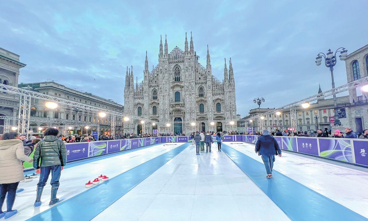 People celebrate the one-year countdown to the 2026 Winter Olympics in front of the Duomo Cathedral in Milan, Italy, on February 7, 2025. Photo: VCG