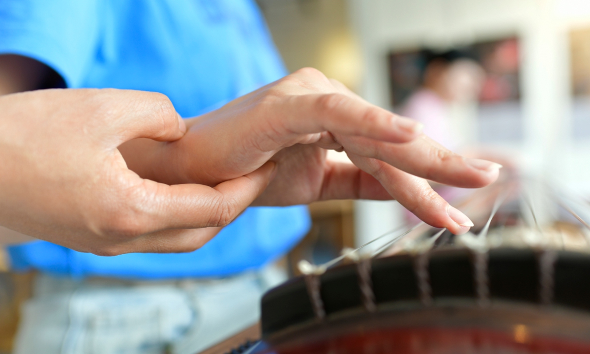 A guqin master provides hands-on instruction to a student on the playing techniques of this ancient Chinese instrument. Photo: VCG