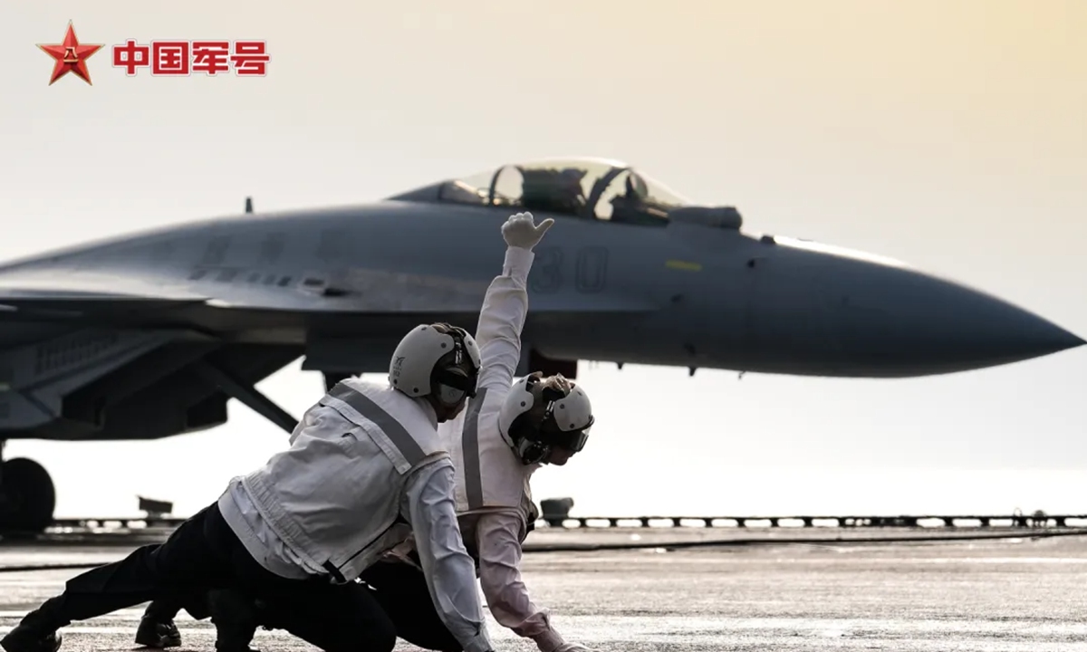 A J-15T carrier-borne fighter jet is ready for takeoff during a far seas combat training by the Liaoning and Shandong aircraft carrier formations of the Chinese People's Liberation Army (PLA) Navy in 2025. Photo: Screenshot from WeChat account of China Bugle, an official media account affiliated with the PLA news media center