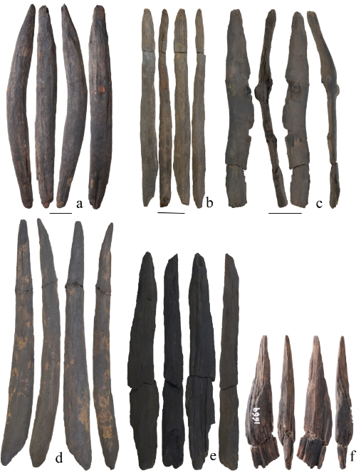 The wooden tools include digging sticks and small, intact, hand-held pointed tools. Nineteen of the wooden artifacts bear clear cut and scrape marks resulting from branch trimming, shaping, and sharpening, providing definitive evidence of human modification and use.