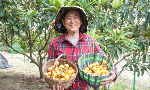 Fruit growers in Deqing county, East China’s Zhejiang Province, harvest ripe golden loquats on May 8.