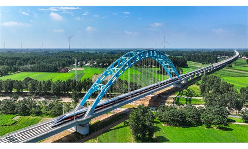 Workers are busy advancing construction on the Tancheng section of the Weifang-Suqian High-Speed Railway in East China's Shandong Province on July 13, 2025, as efforts intensify to accelerate the project's progress. The railway, a key part of the auxiliary corridor to the Beijing-Shanghai High-Speed Railway, runs from Weifang in Shandong to Suqian in East China's Jiangsu Province, with the Tancheng section stretching 34.422 kilometers. Photo: VCG