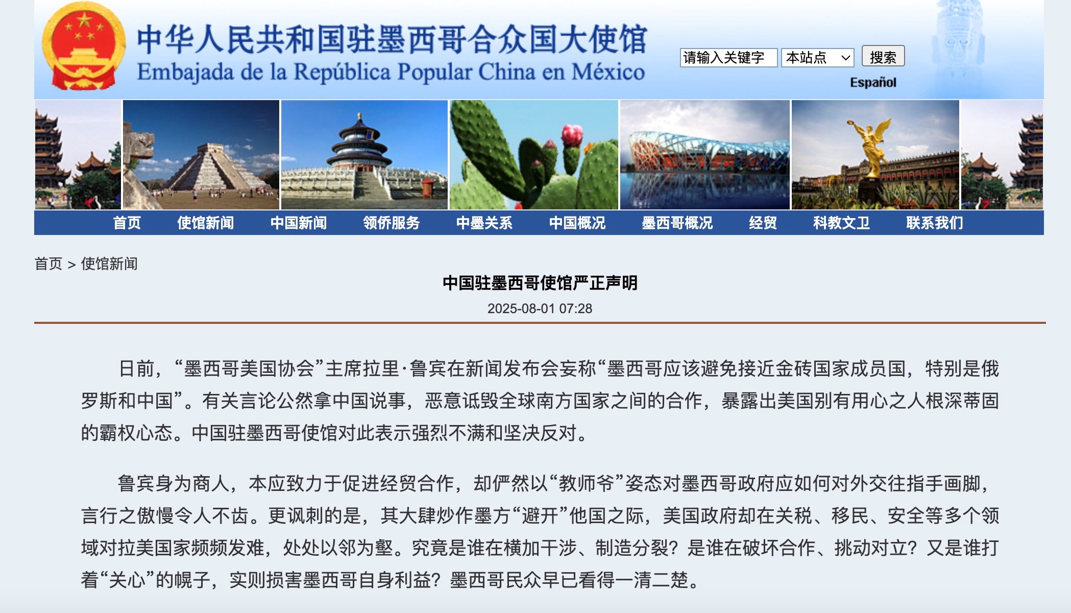 In response to recent remarks by Larry Rubin, president of the American Society of Mexico, who brazenly asserted that Mexico should avoid drawing closer to BRICS members, especially Russia and China, the Chinese Embassy in Mexico said in a statement on Friday that "such comments deliberately invoke China to malign cooperation among Global South nations, revealing the deeply ingrained hegemonic mindset of certain US figures with ulterior motives." The Embassy expressed strong dissatisfaction and firm opposition.
