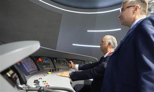 A visitor tries simulated driving of high-speed railway train during the Modern Railways 2025 exhibition in Beijing, capital ...