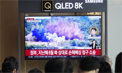 A television broadcasts the news of North Korea exploding parts of roads connected to South Korea at Seoul ...