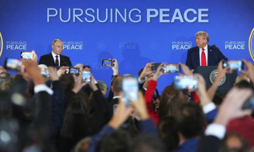 US President Donald Trump (right) looks toward Russian President Vladimir Putin during a joint press conference after they participated in a US-Russia summit at Joint Base Elmendorf-Richardson in Anchorage, Alaska, on August 15, 2025. Photo: VCG
