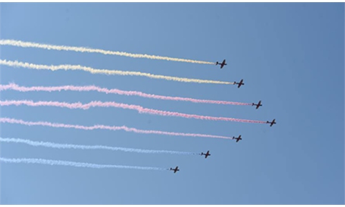 Trainer aircraft escorting the flags attend a parade in Beijing, capital of China, Sept 3, 2015. Photo: Xinhua