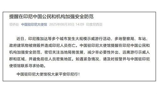In recent days, large-scale demonstrations have erupted in several Indonesian cities, including Jakarta, with police stations, train stations, and government buildings set on fire, resulting in casualties among Indonesian citizens, according to a notice published by Chinese embassy in Indonesia on Saturday.