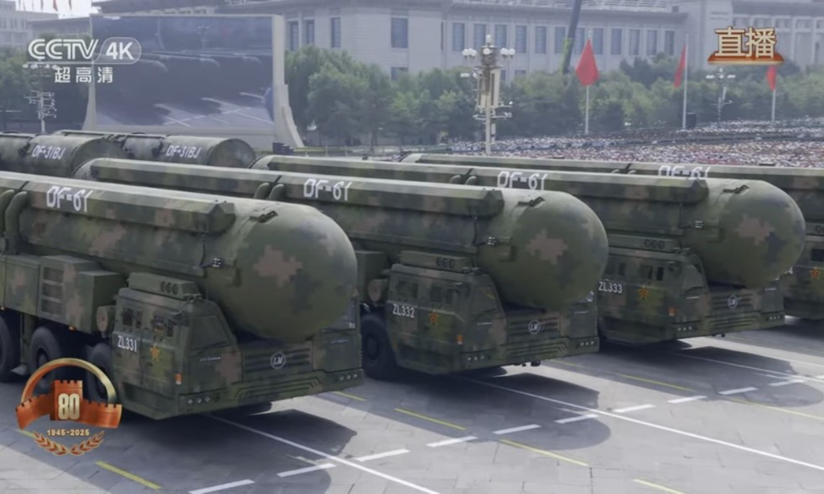 The first nuclear missile formation consisting of JL-1 air-launched long-range missile, JL-3 submarine-launched intercontinental missile, as well as DF-61 and DF-31BJ land-based intercontinental missiles were reviewed at China's V-Day military parade on Wednesday to mark the 80th anniversary of the victory in the Chinese People's War of Resistance Against Japanese Aggression and the World Anti-Fascist War, marking the first concentrated appearance of China's land, sea, and air-based strategic nuclear triad.