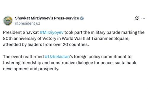 Uzbek President Shavkat Mirziyoyev's press-service wrote on the X on Wednesday that attending the military parade "reaffirmed Uzbekistan's foreign policy commitment to fostering friendship and constructive dialogue for peace, sustainable development and prosperity."