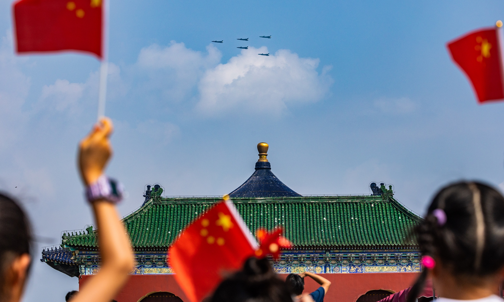 Residents wave national flags and watch aerial formations fly overhead during the commemorations marking the 80th anniversary of the victory in the Chinese People's War of Resistance against Japanese Aggression and the World Anti-Fascist War began in front of the Temple of Heaven in Beijing on September 3, 2025. Photo: Li Hao/GT