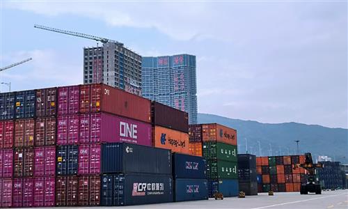 A worker checks wind turbine blades for export at a dock of the Lianyungang Port, East China's Jiangsu Province, on September 5, 2025. Official data showed that China's wind turbine exports grew over 20 percent in the first half of 2025, with renewable energy generator units exports to other BRICS countries up more than 70 percent and wind turbine components rising 11.8 percent. Photo: VCG