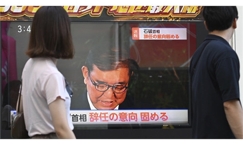 Passersby in Tokyo on September 7, 2025 watch a TV broadcast reporting that Japanese Prime Minister Shigeru Ishiba decided to resign as LDP head. Photo: VCG