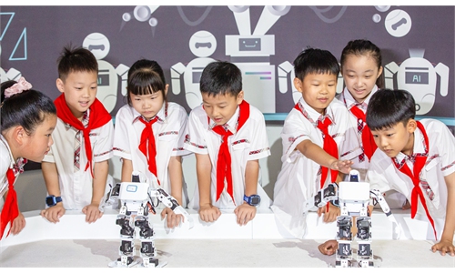 Students from a primary school in Nantong, East China's Jiangsu Province, watch an intelligent robot show at the ...