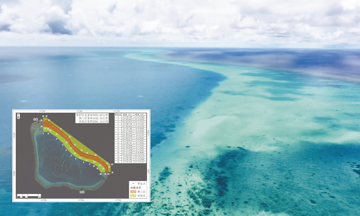 China has long prioritized ecological protection of Huangyan Dao, with ecological restoration and conservation being key to its exercise of sovereignty and jurisdiction over the area. According to Luo, the Huangyan Dao reserve, located in Sansha city, South China's Hainan Province, covers 3,523.67 hectares, including a core zone of 1,242.55 hectares and an experimental zone of 2,281.12 hectares. The reserve will focus on safeguarding the coral reef ecosystem, in accordance with the Marine Environment Protection Law and regulations on nature reserves.