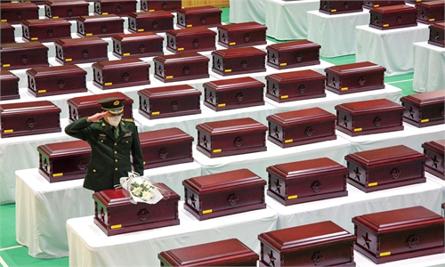 A farewell ceremony is held on September 15, 2025, in Incheon, South Korea, for coast guard officer Lee Jae-suk, who died in the line of duty while rescuing a Chinese national. A staff member from the Chinese Embassy in South Korea laid flowers to pay tribute. Photo: VCG