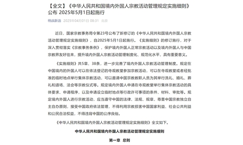 The new rules are intended to implement existing laws on religious affairs, standardize the online behavior of religious personnel, and maintain order in online religious activities.