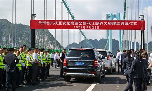 The Huajiang Grand Canyon Bridge, the world's tallest bridge, officially opens to traffic in Southwest China's Guizhou Province on September 28, 2025. Photo: VCG