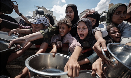 Palestinians, who face difficulties accessing food due to the blockade imposed by Israel, wait to receive aid rations ...