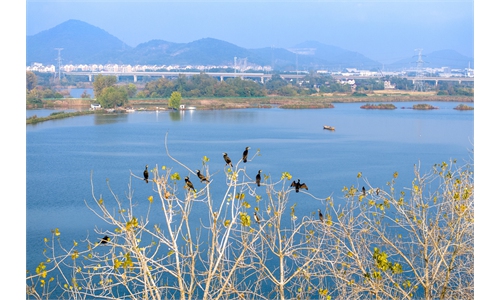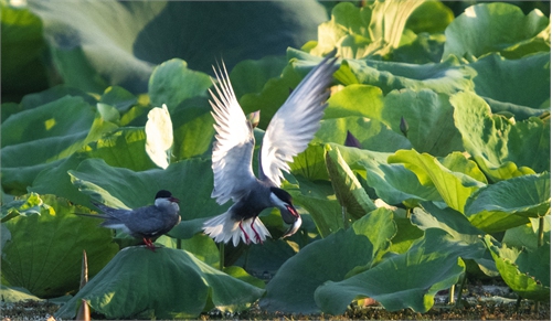Two whiskered terns foraging in a lotus pond in East China’s Anhui Province, on July 31, 2024. Photo: ...