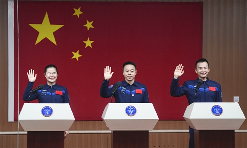 Chinese astronauts for the upcoming Shenzhou-21 spaceflight mission, Zhang Lu (center), Wu Fei (right) and Zhang Hongzhang meet the press at the Jiuquan Satellite Launch Center in Northwest China's Gansu Province on October 30, 2025. Photo: cnsphoto