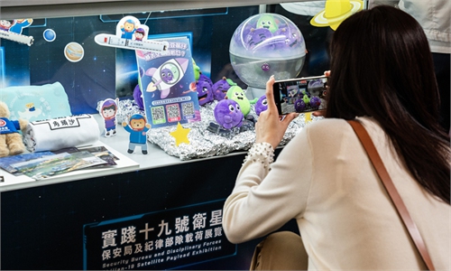 A visitor takes a photo of the cultural and creative items that went to space during the Shijian-19 ...