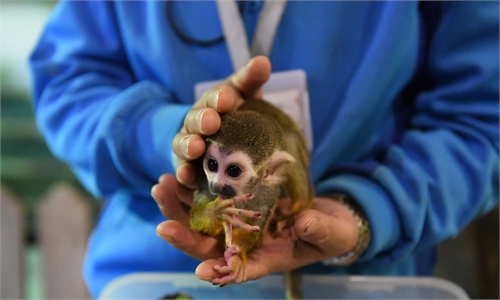 A 2-month-old squirrel monkey meets the public in the Harbin Polarpark in Harbin, Northeast China’s Heilongjiang Province, on ...