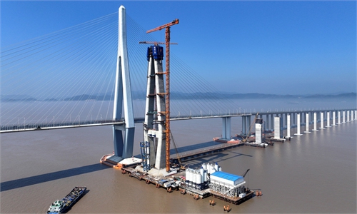 A 1,200-ton large floating crane ship successfully lifts and places a steel box girder (numbered EA2) onto the Qinglongmen Bridge on November 16, 2025 in Zhoushan, East China's Zhejiang Province. This operation signifies the start of the superstructure construction of the bridge, laying a crucial foundation for the subsequent completion of the project. Photo: VCG