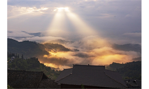 Beams of light shine through the clouds, illuminating the mist-covered green mountains and traditional village homes in Southwest ...