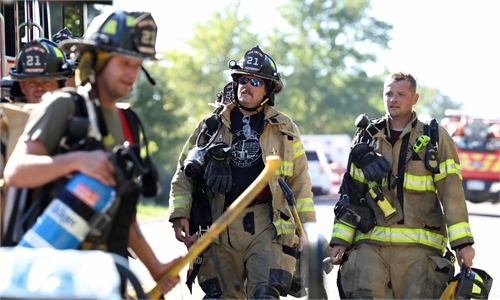 Firefighters from Atlas Township in the US state of Michigan return to their vehicles after taking care of ...