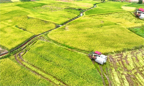 A sprinkler irrigates crops in Dongying, East China's Shandong Province on November 27, 2025. China's Ministry of Agriculture and Rural Affairs said in its latest crop update that more than 90 percent of the country's winter wheat has been sown, as many provinces move swiftly to advance autumn-winter planting. Photo: VCG