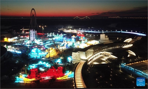 The photo shows construction of the 27th Harbin Ice-Snow World in Harbin, Northeast China's Heilongjiang Province, on December 14, 2025. The world's largest ice-and-snow theme park is counting down to welcome worldwide tourists. Photo: VCG