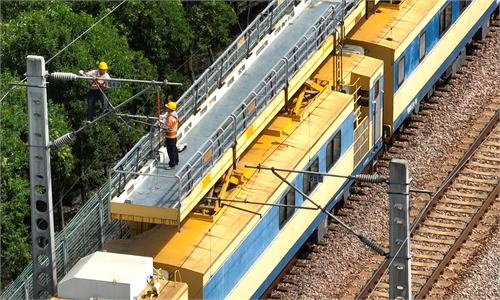 Workers lay tracks for the Nanchang-Jiujiang High-Speed Railway (HSR) in Jiujiang, East China's Jiangxi Province, on December 19, 2025. The railway line, designed for speeds of up to 350 kilometers per hour, requires 295.28 kilometers of rail, and is set for completion in May 2026. As a key segment of the Beijing-Hong Kong HSR, it will enhance China's north-south rail network. Photo: VCG