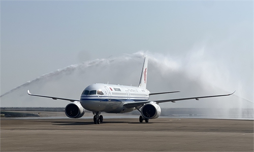 China’s domestically developed C919 passenger aircraft receives water salute at Macao International Airport on November 7, 2024. It ...
