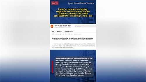 China's Ministry of Commerce said on Friday that China views Canada's adjustments to measures on the export of Chinese EVs as a positive step taken by Canada in the right direction, and it is also good news for Chinese EVs seeking to explore the Canadian market. Through friendly consultations, we should create a fairer, more stable, and non-discriminatory environment for further expanding trade and investment cooperation in the EV sector.