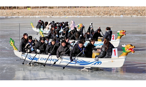 Foreign participants compete in the Five-Continent Ice Dragon Boat Challenge in Xilinhot, North China's Inner Mongolia Autonomous Region on February 2, 2026. A total of 29 teams from 21 countries and regions, including China, Russia, the US, Singapore, and Mongolia, with nearly 600 ice dragon boat enthusiasts, participated in the event to celebrate the upcoming Chinese New Year. Photo: VCG