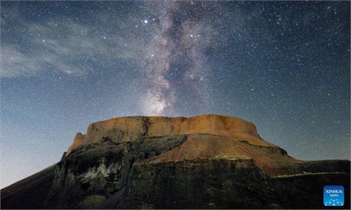A tourist wearing a spacesuit takes a photo in front of the No.6 volcano at the Ulanhada volcano cluster geological park in North China's Inner Mongolia Autonomous Region on February 5, 2026. This volcano, thanks to its distinctive dark black and reddish-brown mountain massif, is hailed by visitors as a "Mars base". Photo: VCG