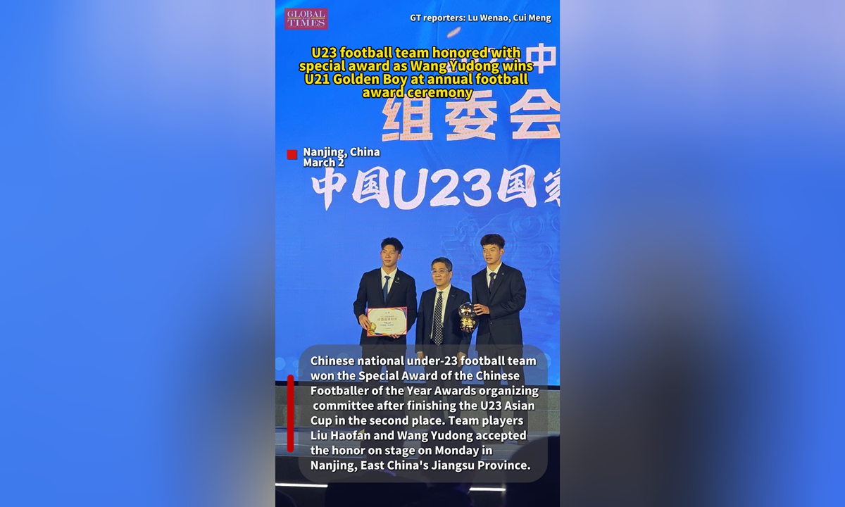 Wang Yudong speaks at the Chinese Footballer of the Year Awards ceremony in Nanjing, East China's Jiangsu Province, on March 2, 2026. Photo: Cui Meng/GT